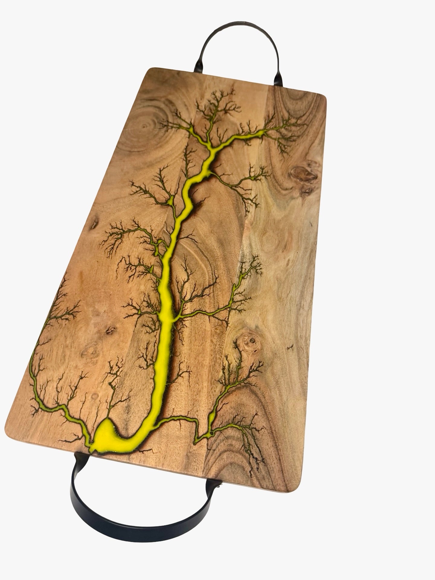 Elevate your hosting with our handcrafted resin serving board — a striking 500mm × 250mm × 15mm piece featuring bold black metal handles and electrifying fractal burn art. Each board is a fusion of sustainable Acacia hardwood and premium food-safe resin, designed to bring both beauty and function to your dining experience.